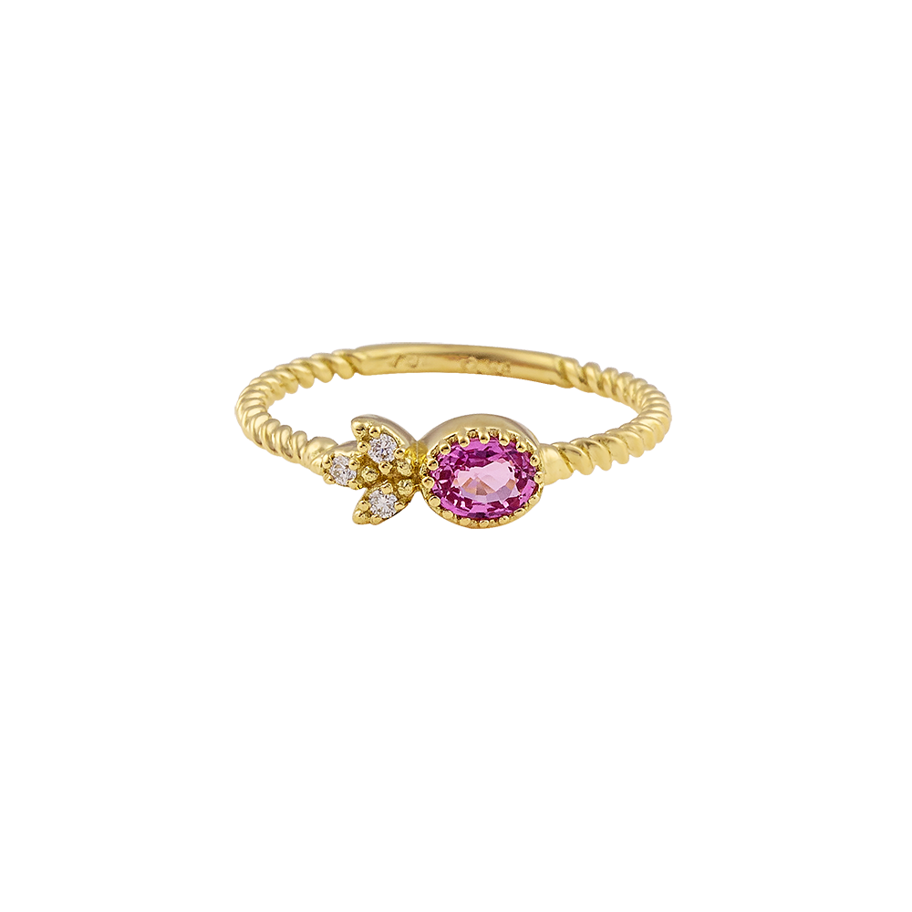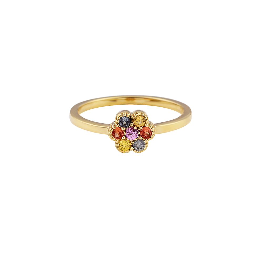 This 18-karat gold rosette ring from the "Lily Colours" collection weighs 1.83g and features a central 0.29ct oval-cut orange sapphire (4.50x3.50mm) accented by 0.12cts of round brilliant cut diamonds—a striking and elegant accessory.