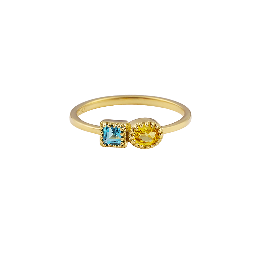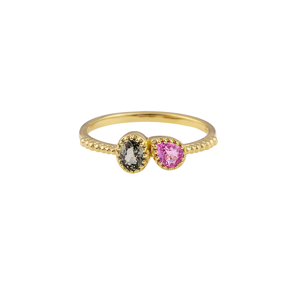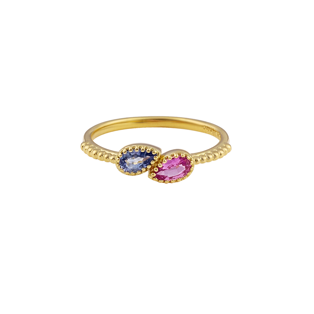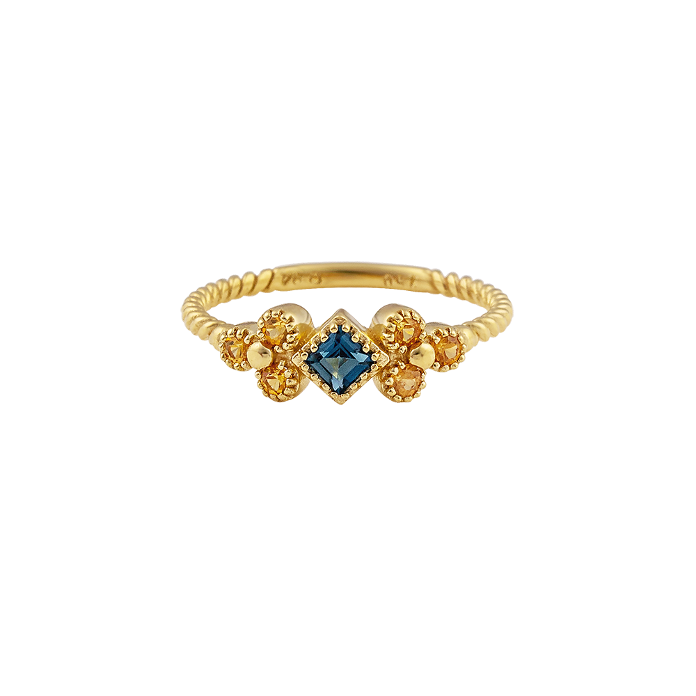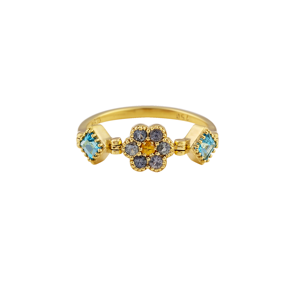 This 18-karat gold ring, weighing 2.61g, features a 0.28ct oval-cut orange sapphire (5x3mm) at its center. It is accented by 0.32cts of square-cut amethysts (3x3mm each stone) and 0.08cts of round-cut orange sapphires. From our Lilly Colours collection, it’s a vibrant blend of elegance and colour.