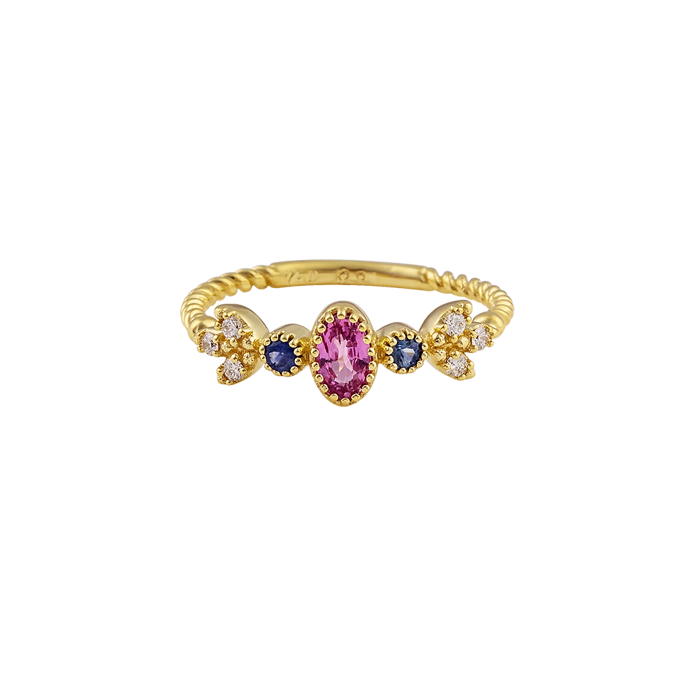 This 18-karat gold half-eternity ring from the "Lily Colours" collection weighs 1.76g and features 0.81cts of oval-cut multicolor sapphires (4.50x3.50mm each stone) accented by 0.16cts of round-cut red sapphires—a delicate and vibrant piece.