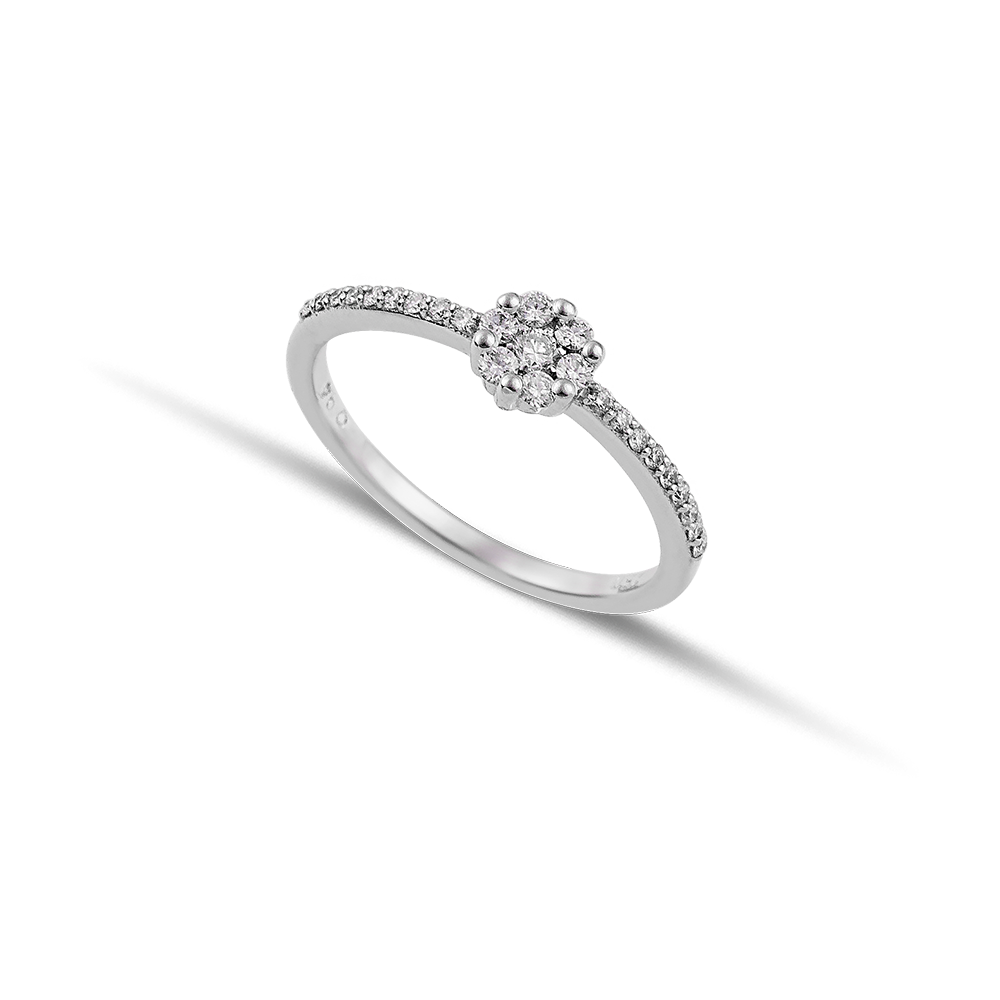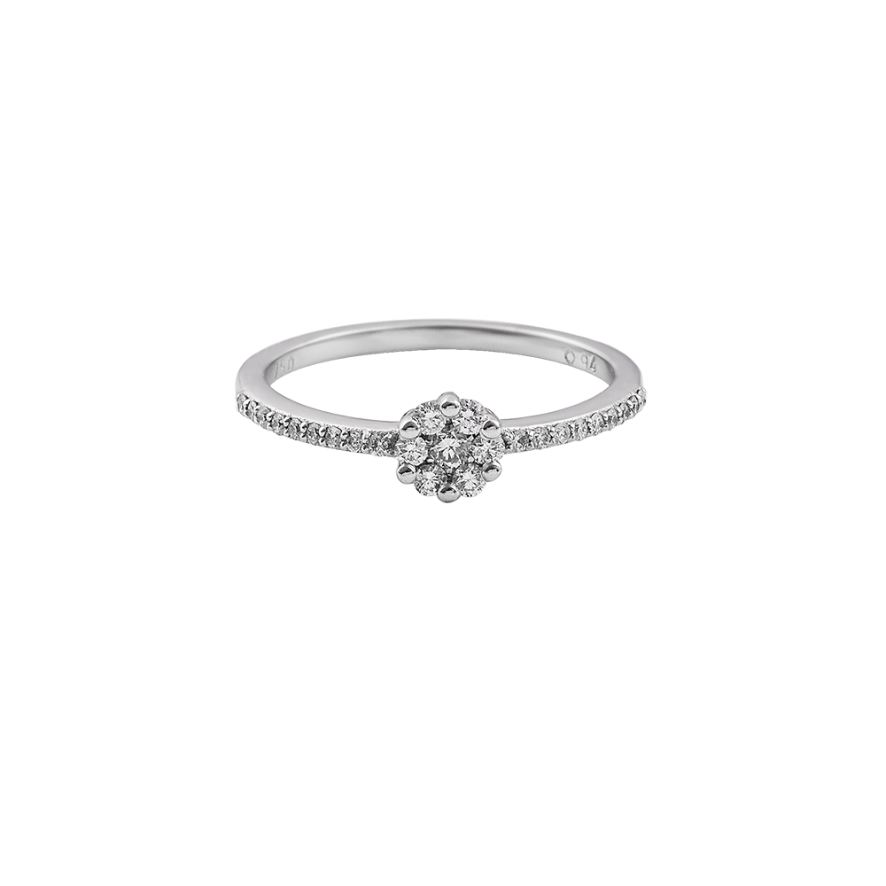 Elevate your style with this sophisticated 18-karat white gold ring. Weighing 2.00g, it features a 0.05ct round brilliant diamond at its center, beautifully encircled by 0.22cts of diamonds along the band to create the stunning illusion of a single, luminous stone.