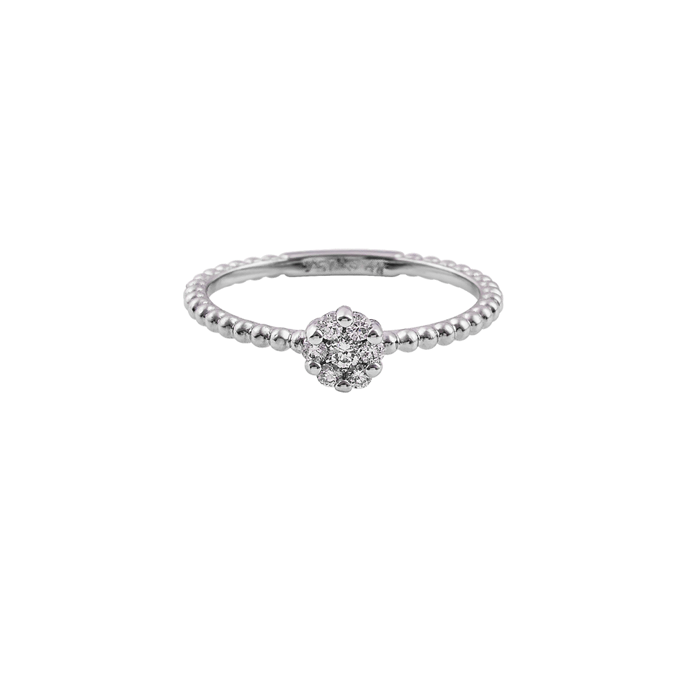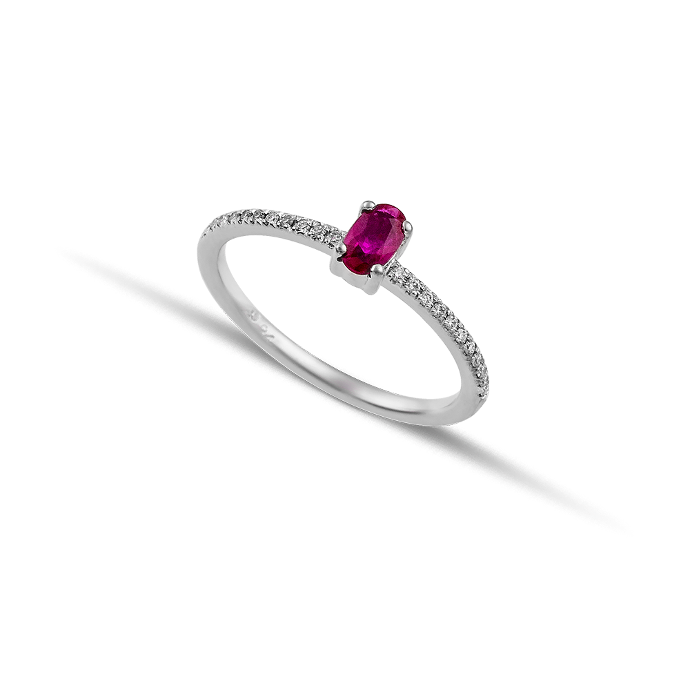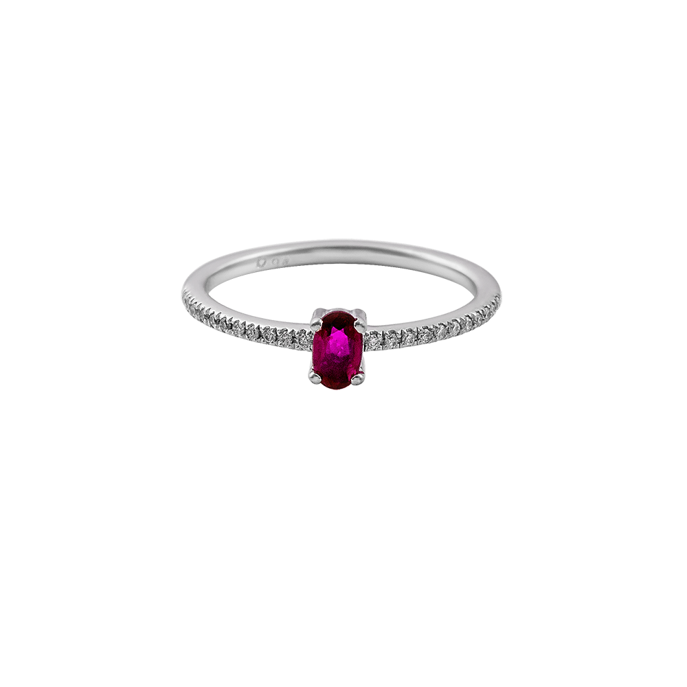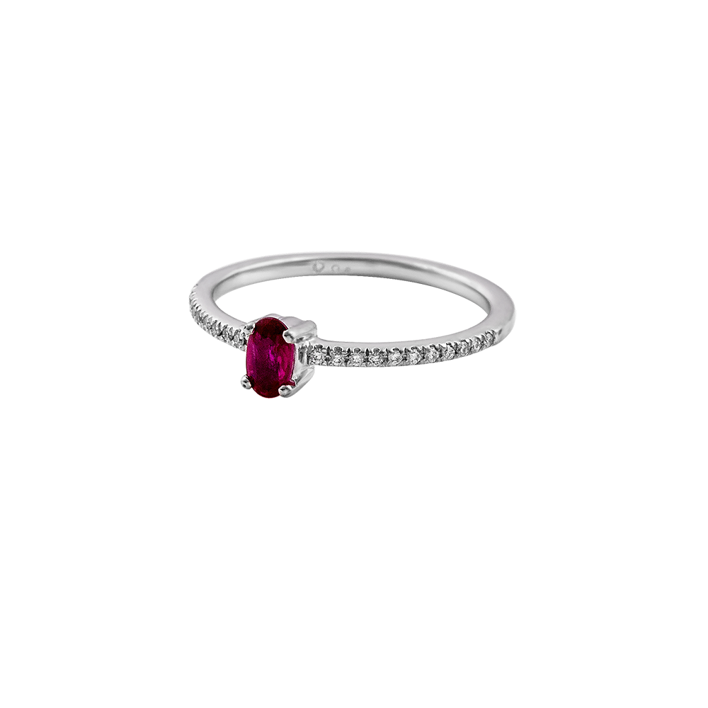 Improve your style with this exquisite 18-karat white gold ring. Weighing 1.90g, it features 0.08cts of round brilliant diamonds that gracefully accentuate a stunning 0.29ct oval-cut ruby (5x3mm) at its center.
