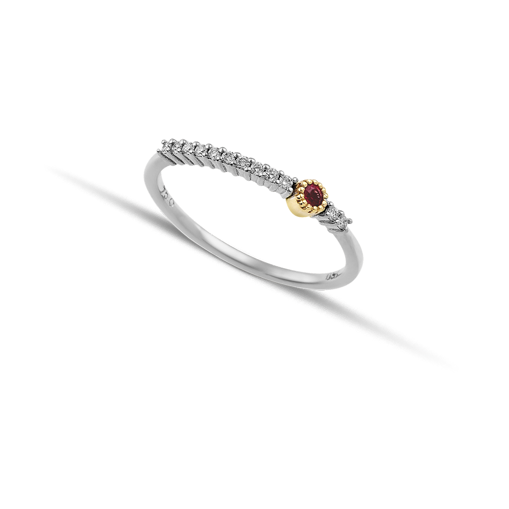Experience versatile elegance with our 18-karat bicolor ring, crafted in both white and yellow gold. Weighing 1.55g, it features 0.08cts of round brilliant cut diamonds and an accent of 0.04ct sapphire or ruby for a subtle pop of color.
