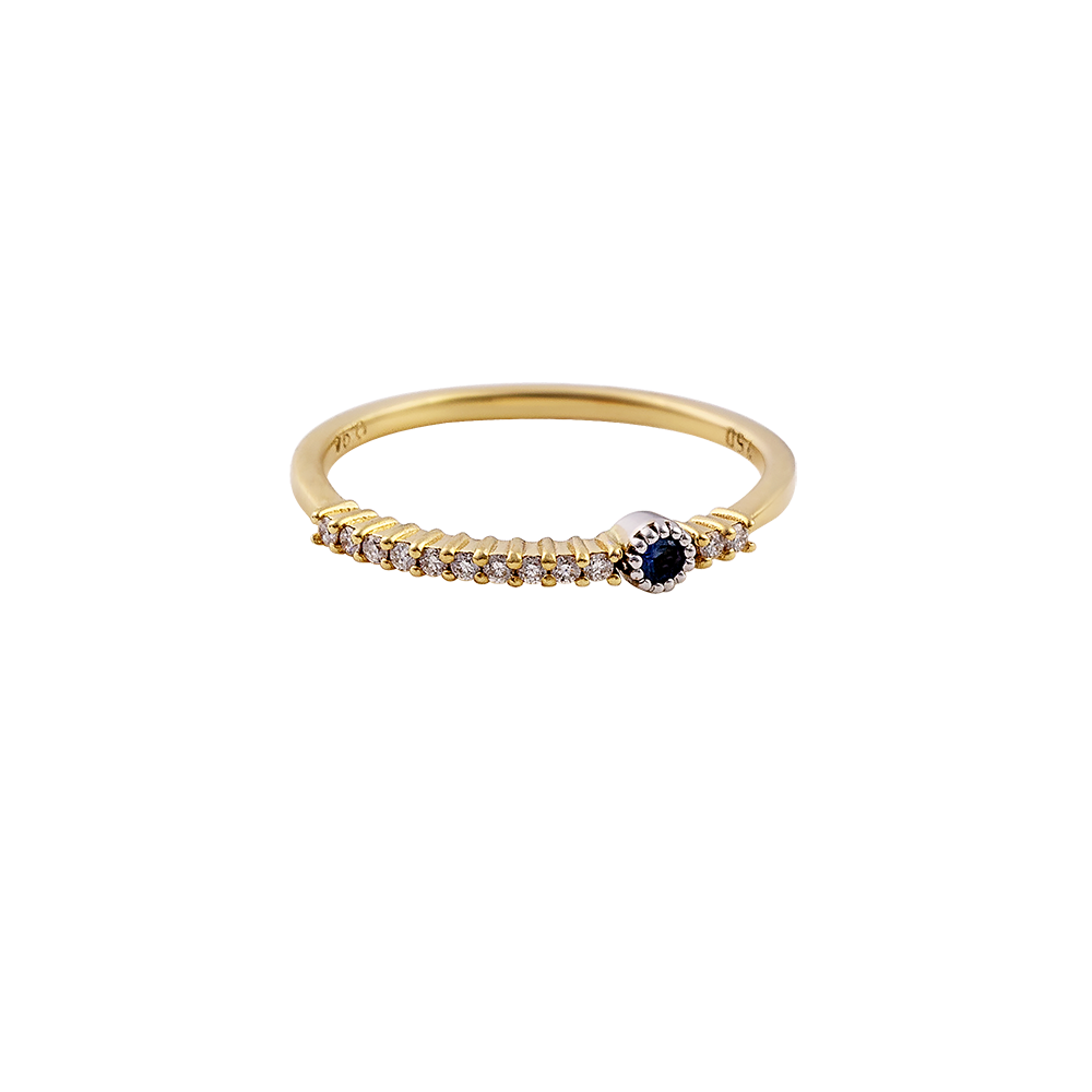 Discover versatile elegance with our 18-karat bicolor ring, crafted from both white and yellow gold. Weighing 1.55g, this piece is enhanced with 0.08cts of round brilliant cut diamonds and features an optional 0.04ct sapphire or ruby accent. Perfect for any occasion, it's a timeless statement of refined style.