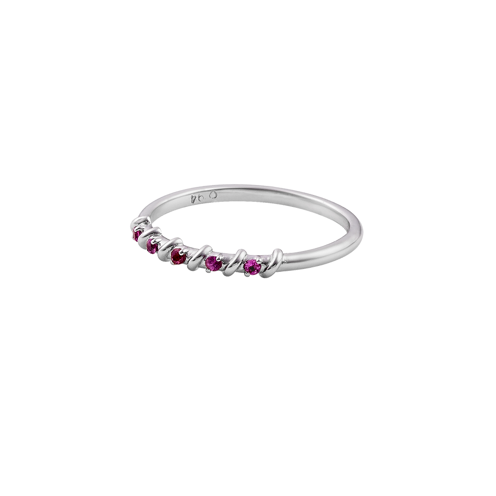 This refined white gold ring features a 1.60g band delicately accented with 0.08cts of round cut rubies, offering understated luxury and timeless charm.