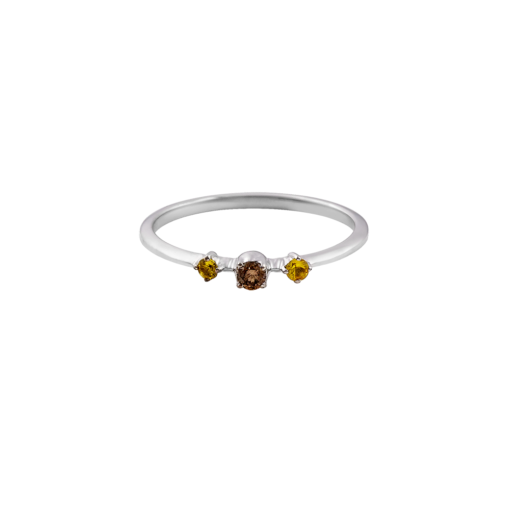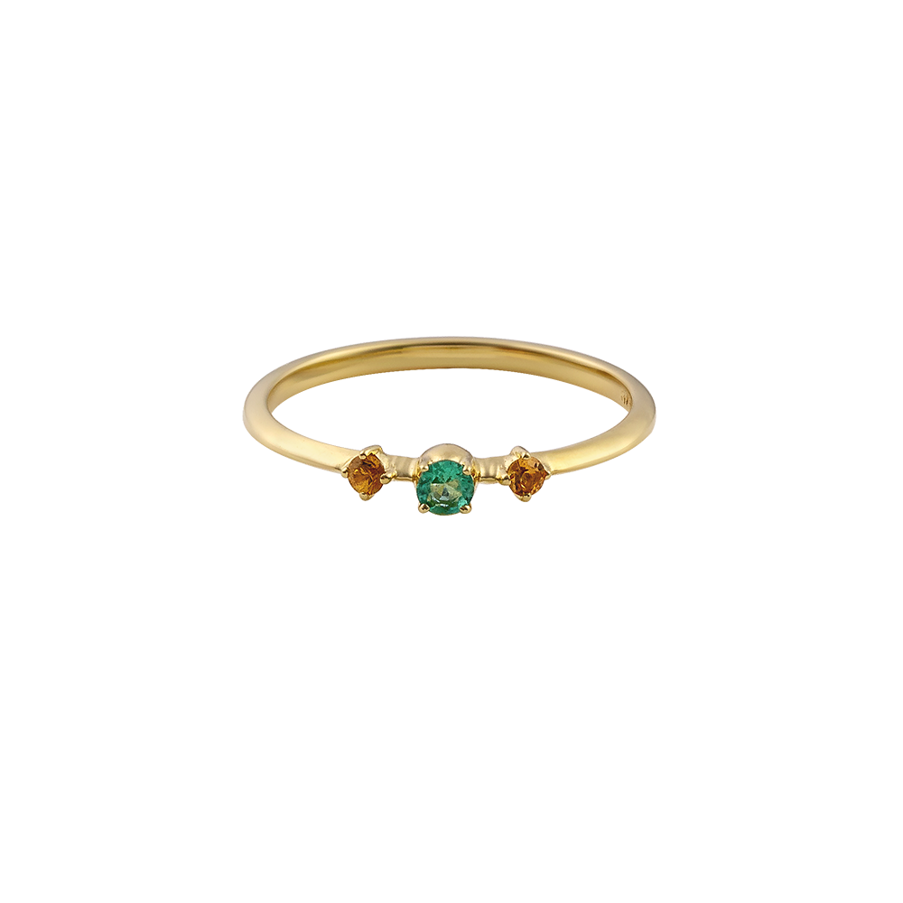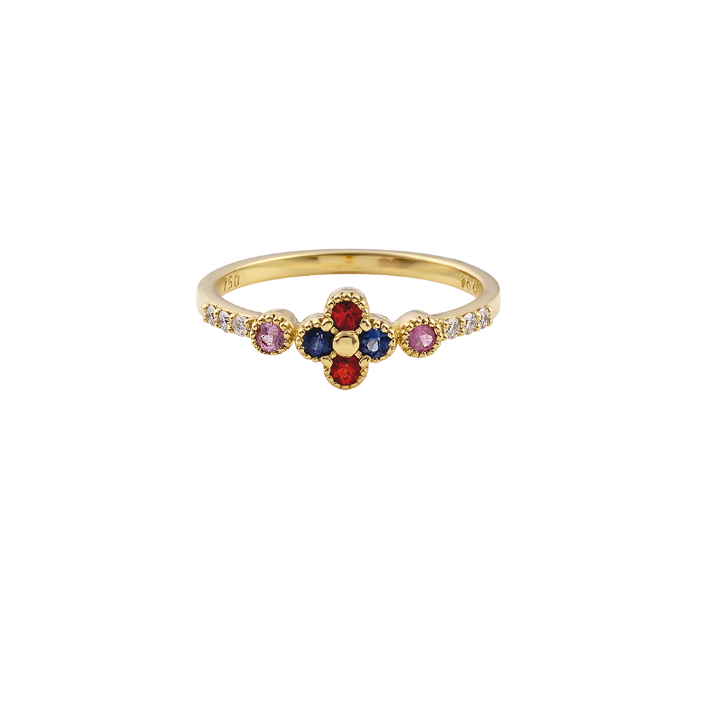 This 18-karat gold ring (2.10g) from the "Lily Colours" collection features a 0.04 ct round-cut yellow sapphire, a 0.27 ct pear-cut sapphire (5.50x3.50mm), and a 0.22ct square-cut rhodolite garnet (3.00x3.00mm).
