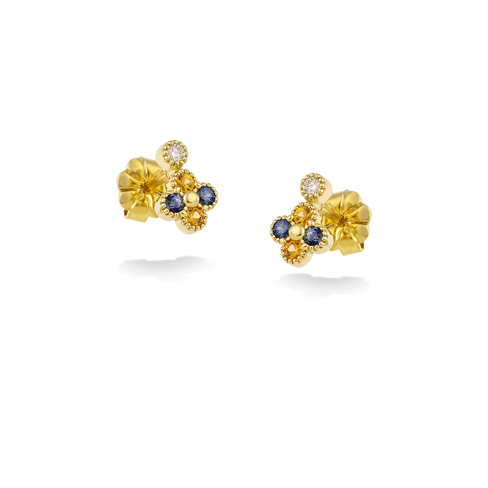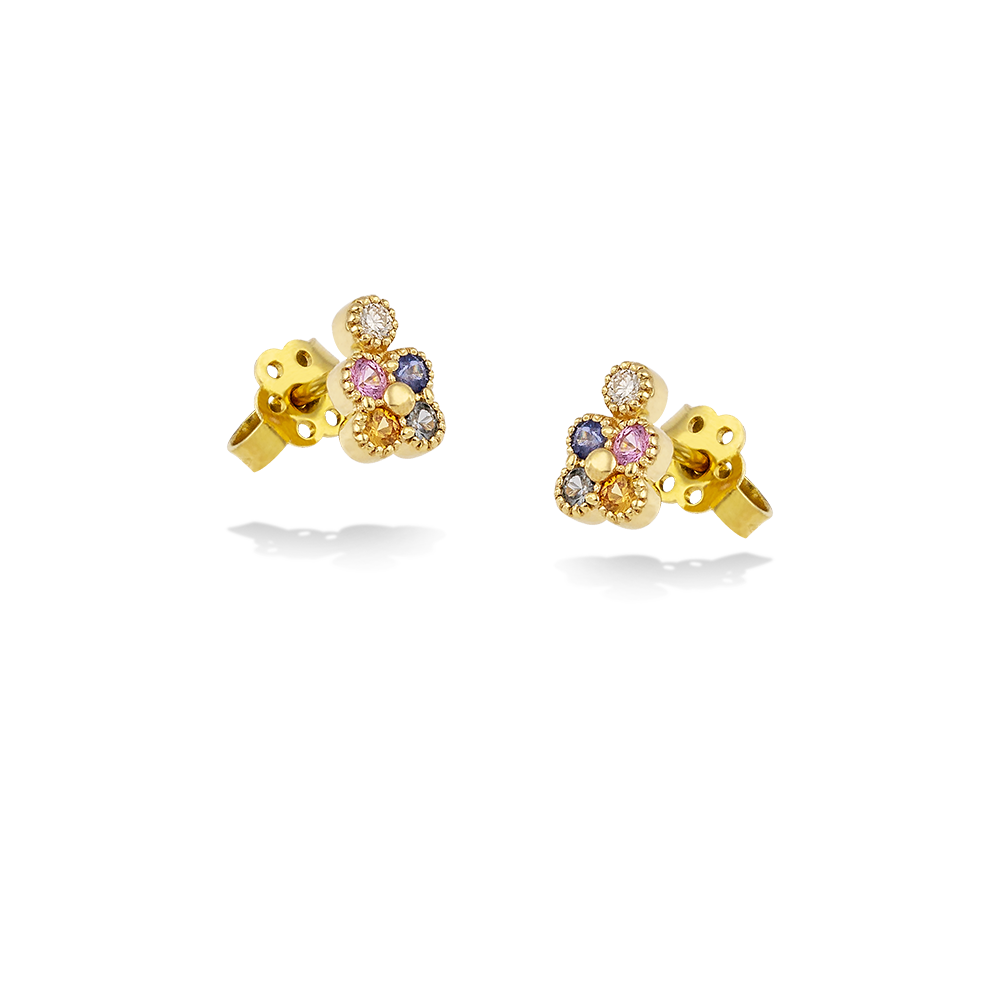 Lily Colours earrings (2.00cm length & 0.50cm width) in 18-karat gold (4.48g) radiate with 3.41cts of oval-cut multicolor sapphires (3.50x4.50mm each stone), offering a refined burst of vibrant hues.