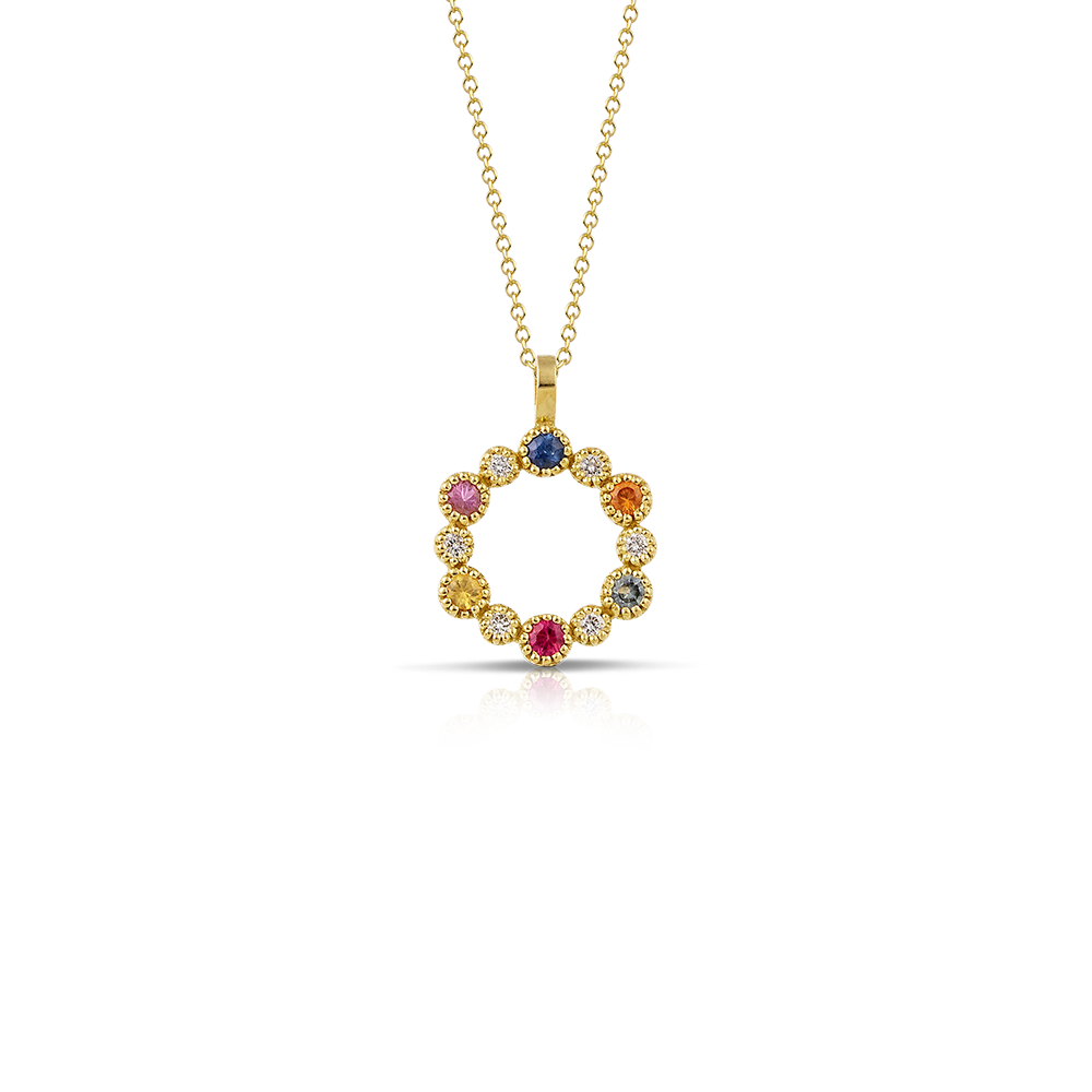 The Lily Colours 18 kt gold pendant (3.65g) showcases an V-shaped motif set with 0.61cts of oval-cut and 0.39cts of round-cut multicolour sapphires, blending yellow, pink, red and light-blue hues atop a finely crafted gold chain.